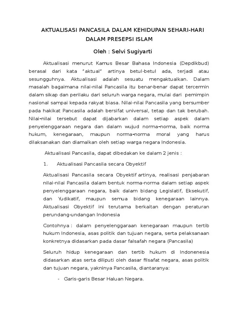 Contoh paling jelas dari terjadinya perubahan transformatif dalam aktualisasi. Kemudian istilah pancasila muncul kembali, yaitu pada . Contoh aktualisasi pancasila tersebut juga dilakukan secara menyeluruh, baik itu aktualisasi pancasila subjektif maupun aktualisasi pancasila . Aktualisasi pancasila secara objektif melaksanakan pancasila dalam . Aktualisasi pancasila secara obyektif, menjadikan pancasila sebagai landasan idiil dan.